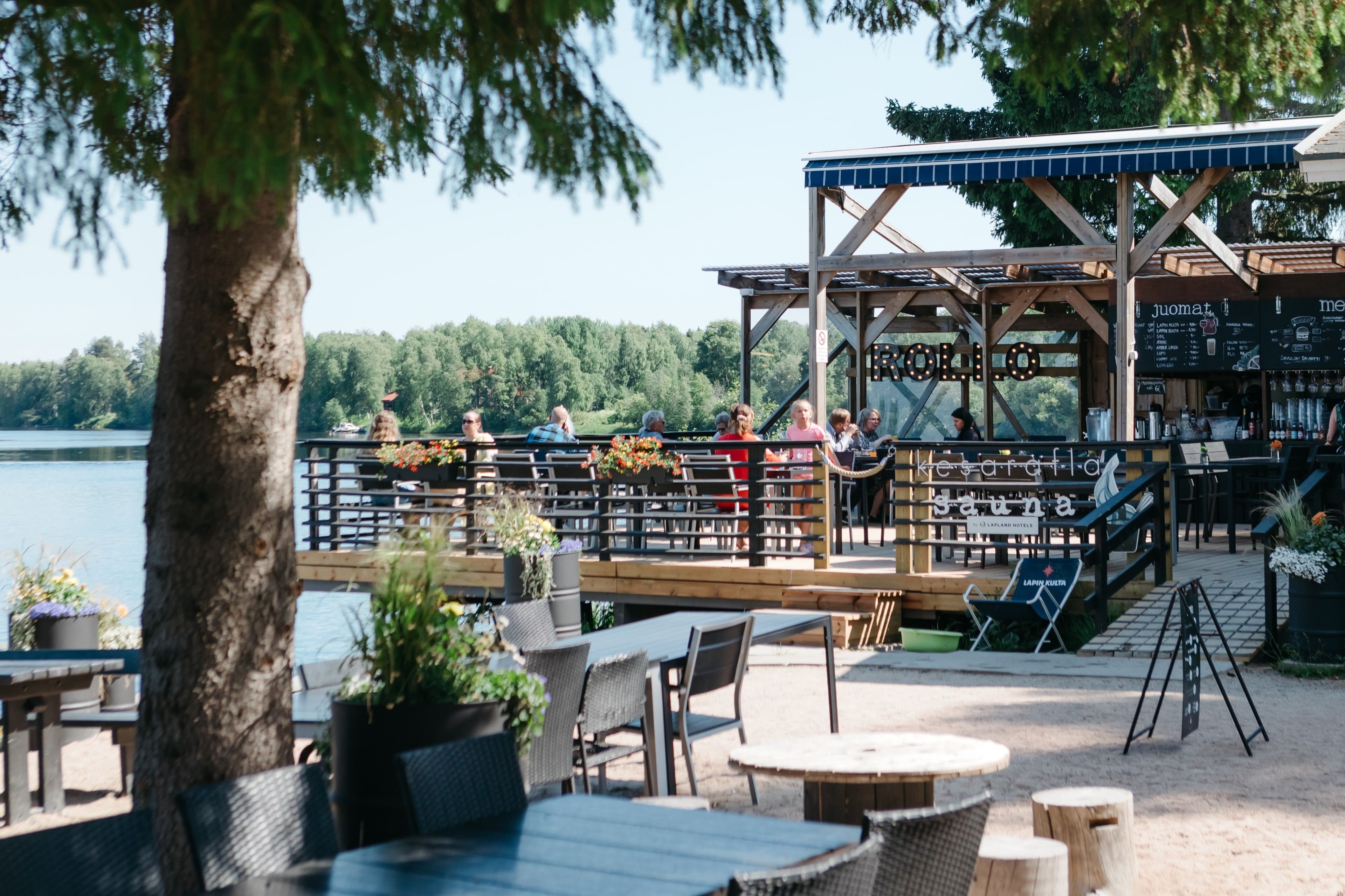 Summer restaurant Kesärafla Sauna is located by the Kemijoki River within the grounds of Lapland Hotels Ounasvaara Chalets, just a 5-minute drive from Rovaniemi city center. You can also access the Kesärafla Sauna by water from the city center. In the terrace restaurant, you can enjoy refreshing drinks while admiring the stunning views of the Kemijoki River and savoring food cooked on a real charcoal grill. During your meal, you can warm up in the wood-heated sauna and take a dip in the river to cool off. The area also offers the opportunity to play beach volleyball and rent SUP boards.