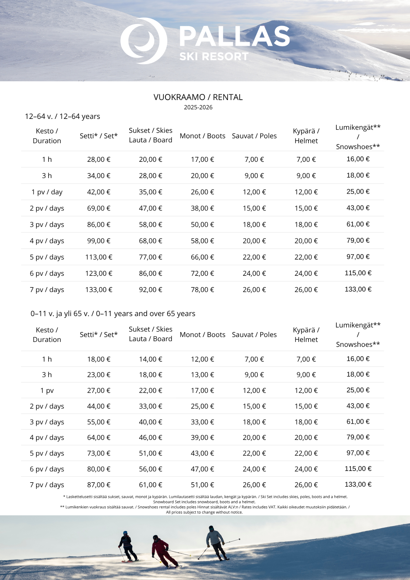 Lift tickets for Pallas can be purchased at the reception of Lapland Hotels Pallas. At the other end of the same building, you will find our rental shop, which offers basic equipment for winter sports. The entrance to the rental shop is at the right side of the parking lot, with stairs leading down to the lower level.