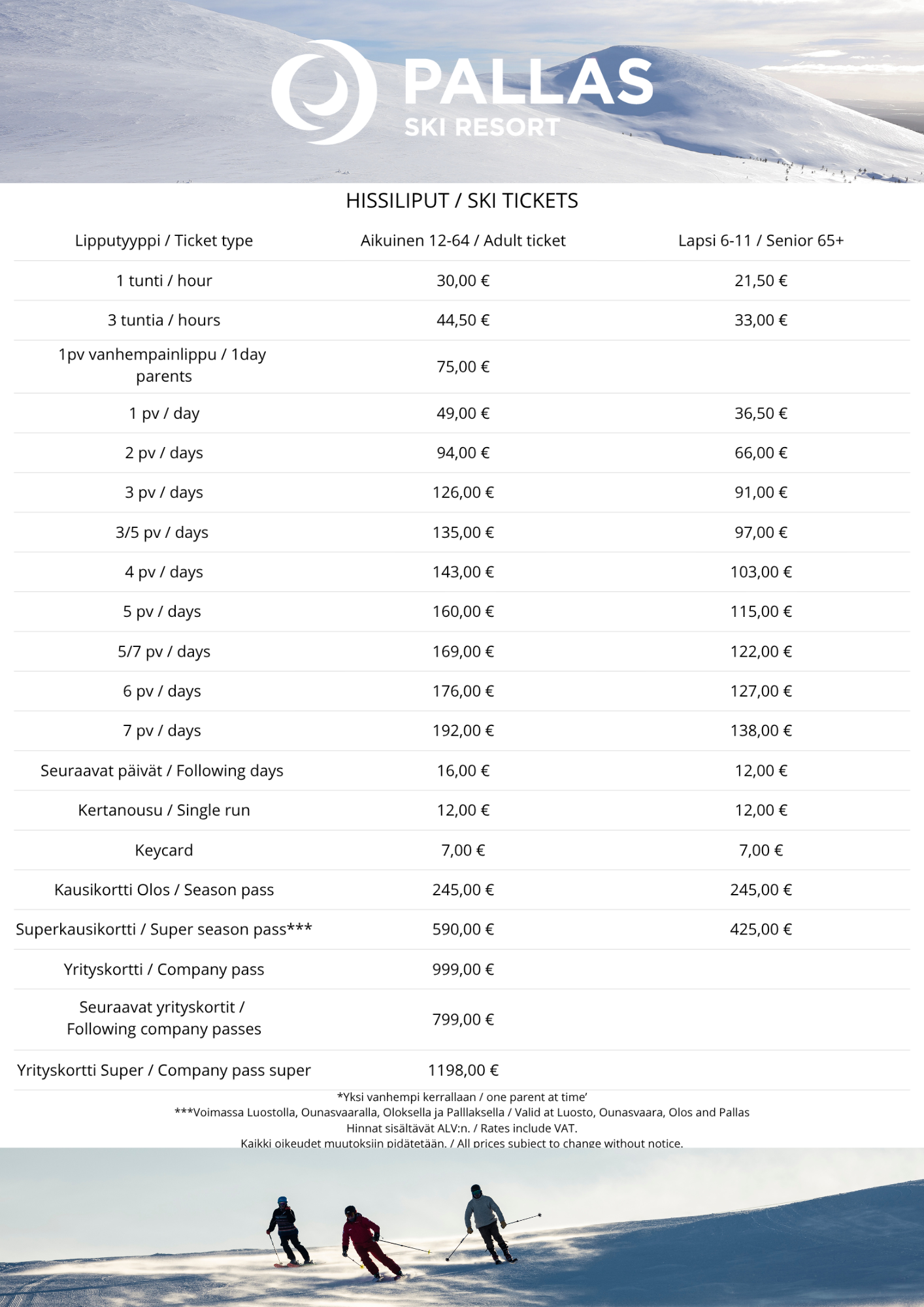 With the Olos/Pallas lift ticket, you can ski at both fells, as well as at Luosto and Ounasvaara. For lift tickets valid for six days or longer, as well as seasonal tickets, you can also ski for one day at Ylläs, excluding the 6/7 day Olos/Pallas ticket.