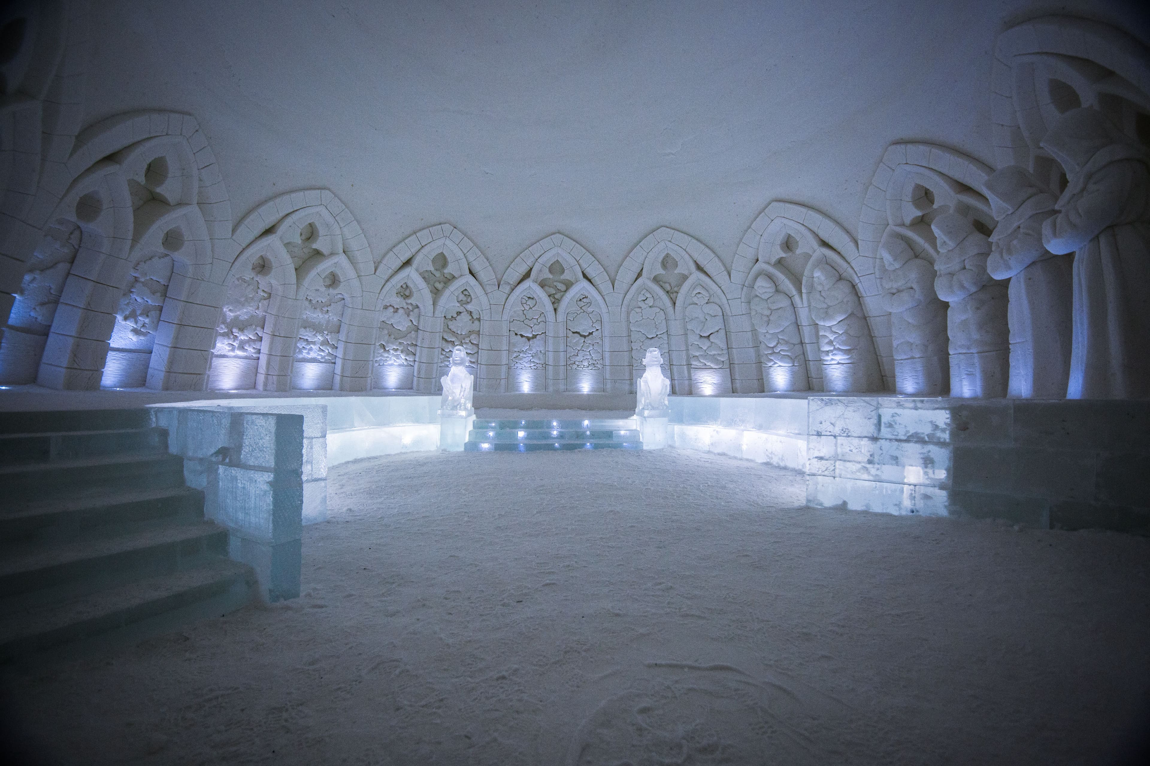 The ceremony space is a true gem for celebrating your important day! The chapel in the ceremony space is different every year, making it a unique and stunning option for significant events. The design and construction of the chapel are entrusted to the world's most skilled ice and snow sculptors. It is built to accommodate approximately 50 people each time. The temperature inside is always between -2 and -5 degrees Celsius, so it's advisable to dress warmly in winter clothing and wear proper winter shoes to avoid slipping.