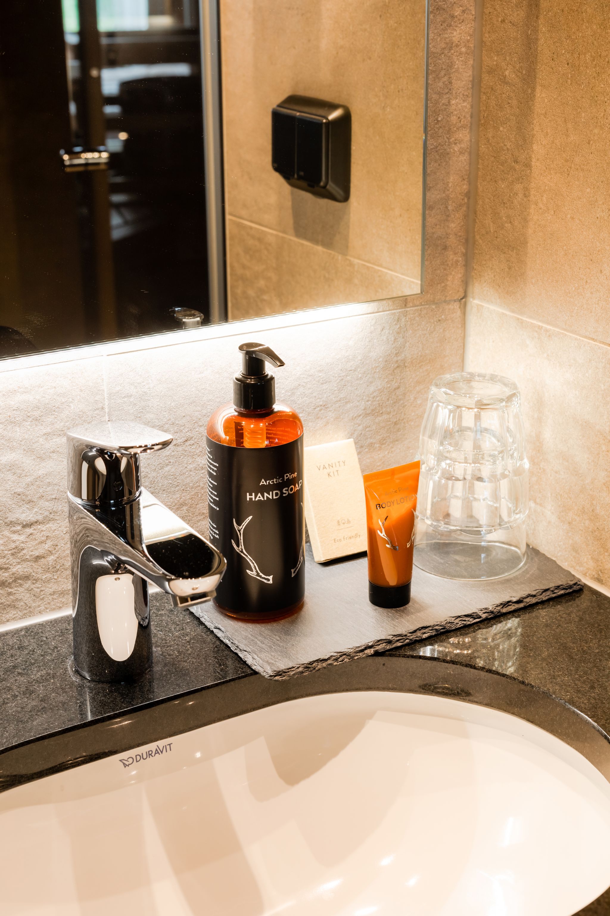 Saunallisissa huoneissa koet omassa rauhassasi rentouttavan pohjoisen tunnelman heti ensiaskeleelta. Pohjoisen luonto näyttäytyy vieraillemme tummana ja mystisenä hopeanhohtoisilla yksityiskohdilla höystettynä.